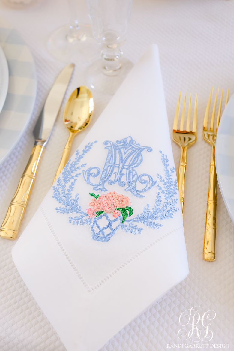 Antique Double Monogram Linen Cocktail Napkins - Embroidered - Monogrammed - Intertwined Monogram - Wedding Gift - Hemstitch - Cloth Coaster